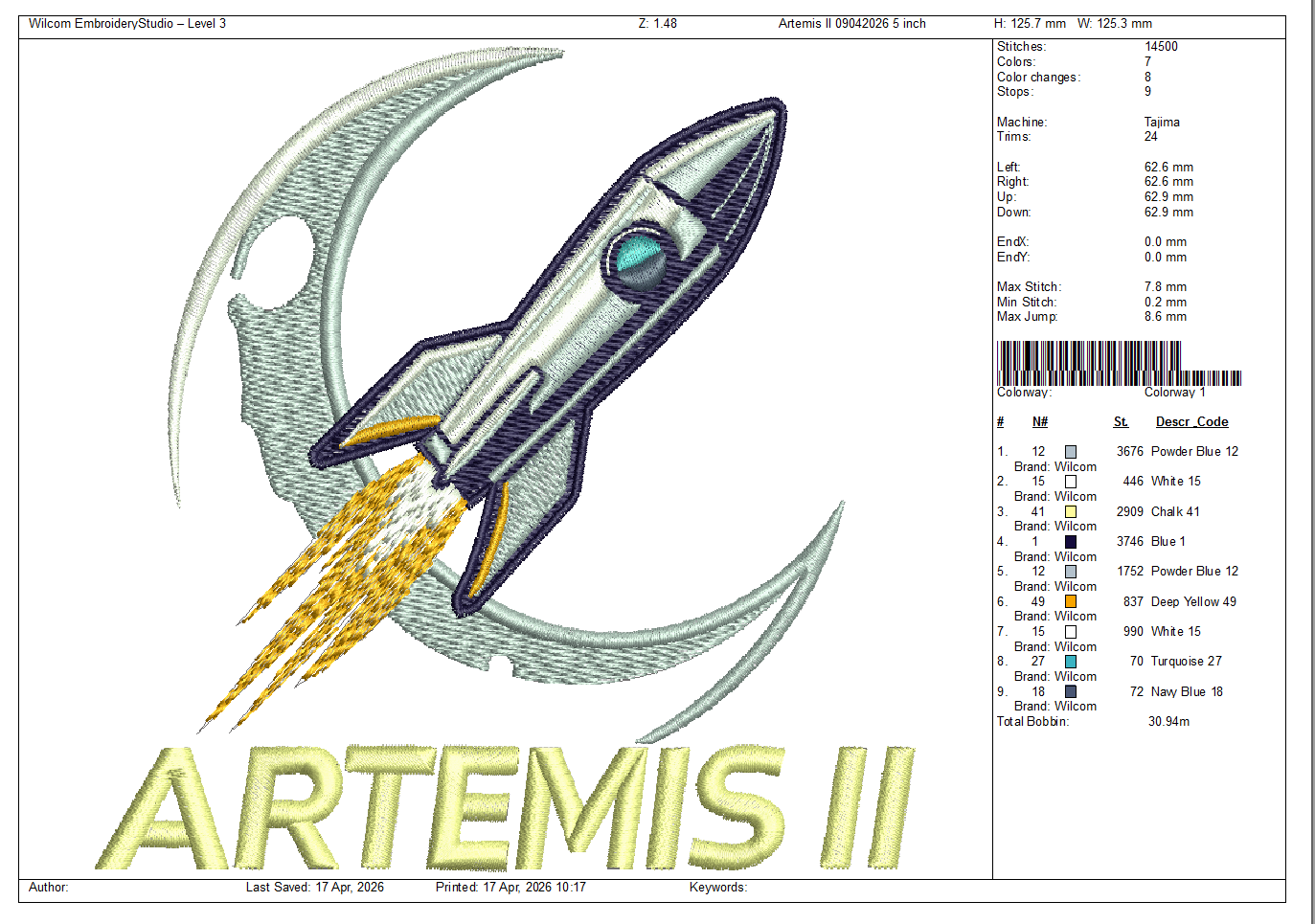 Home :: By Artist :: Valentin Melnic :: Artemis II rocket machine embroidery design