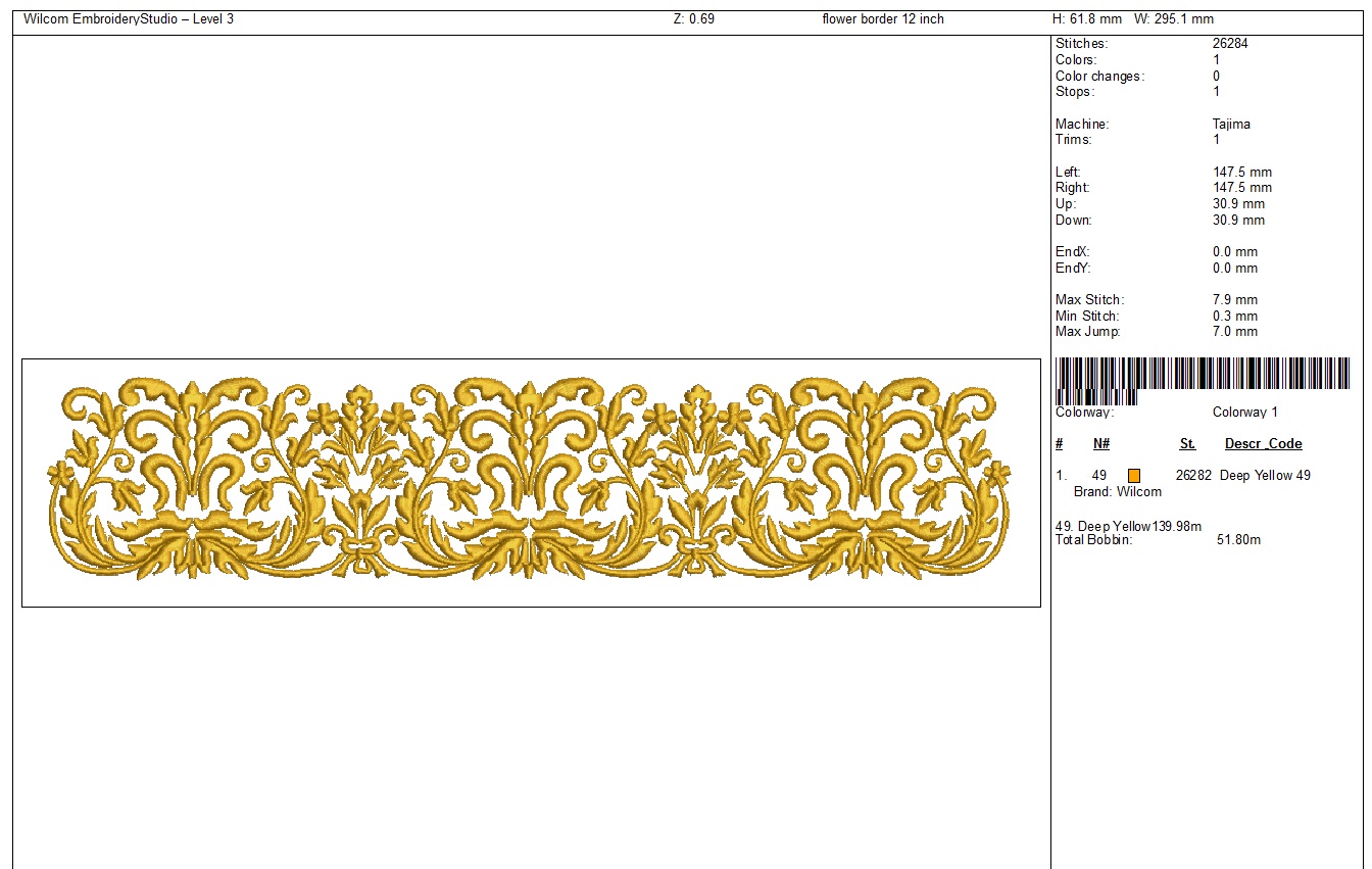 295 mm x 65 mm / 11.8" x 2.6" – 27,000 stitches