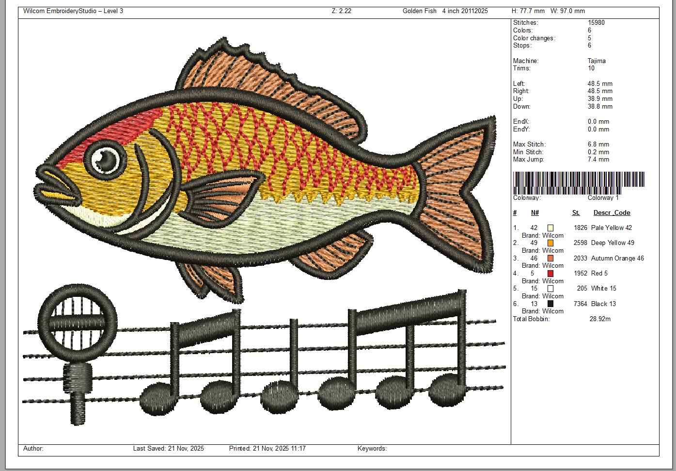 Beautiful golden fish with microphone embroidery design, perfect for fun projects, kids’ apparel, accessories, and decorative textiles. Professionally digitized and tested for excellent stitch quality.