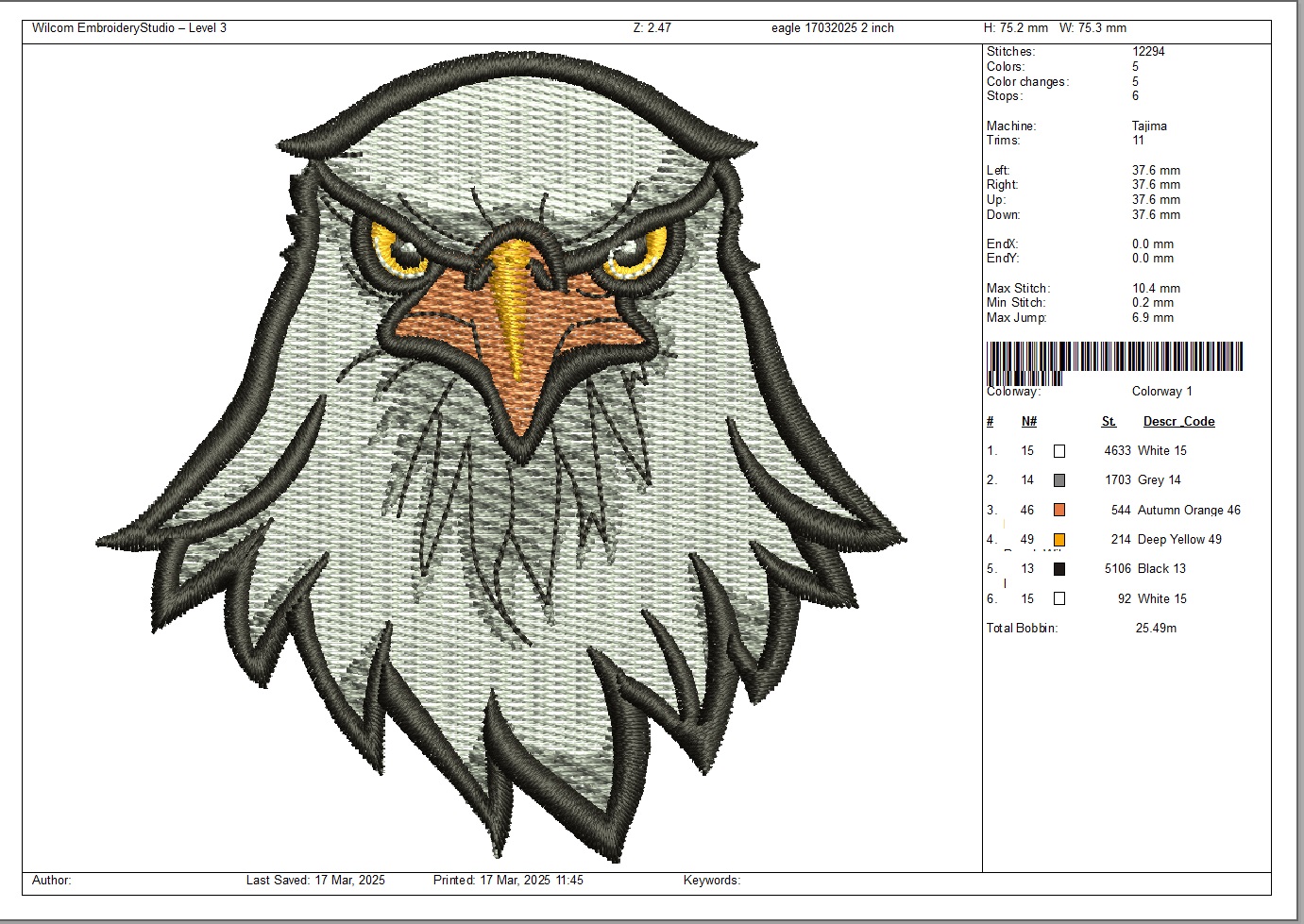 75 mm x 75 mm / 3" x 3" – 12,700 stitches