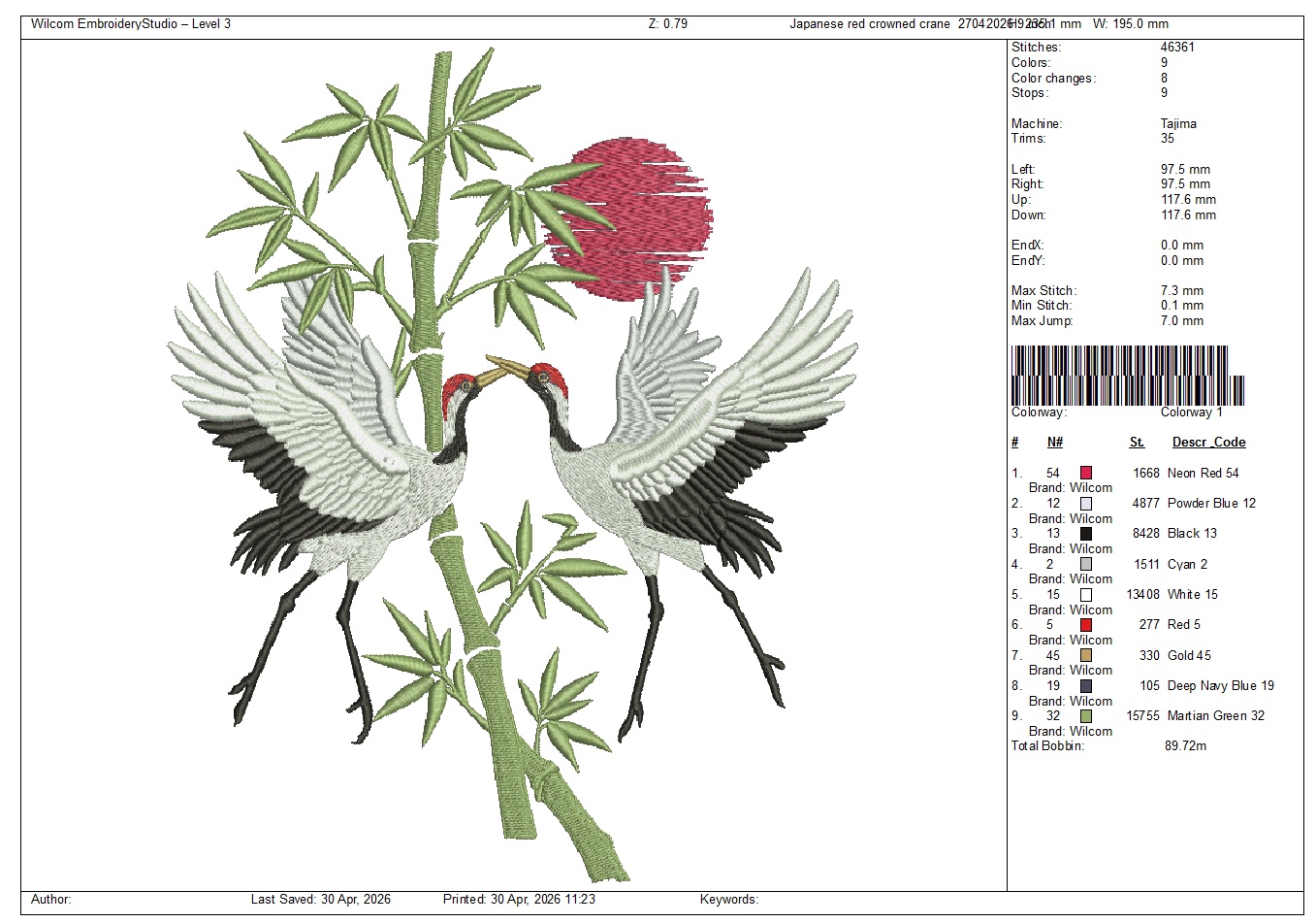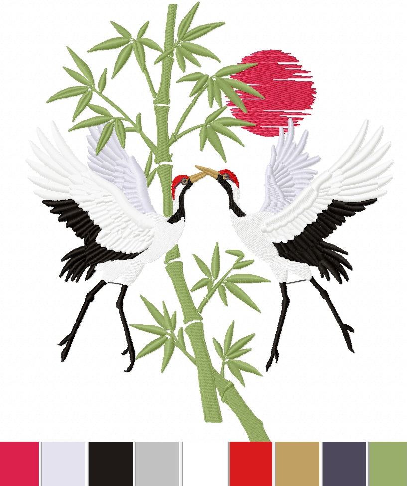 couple of dancing cranes sun and bamboo branch Crane Bird Embroidery Design, Asian Bamboo Floral Motif, Large Satin Stitch