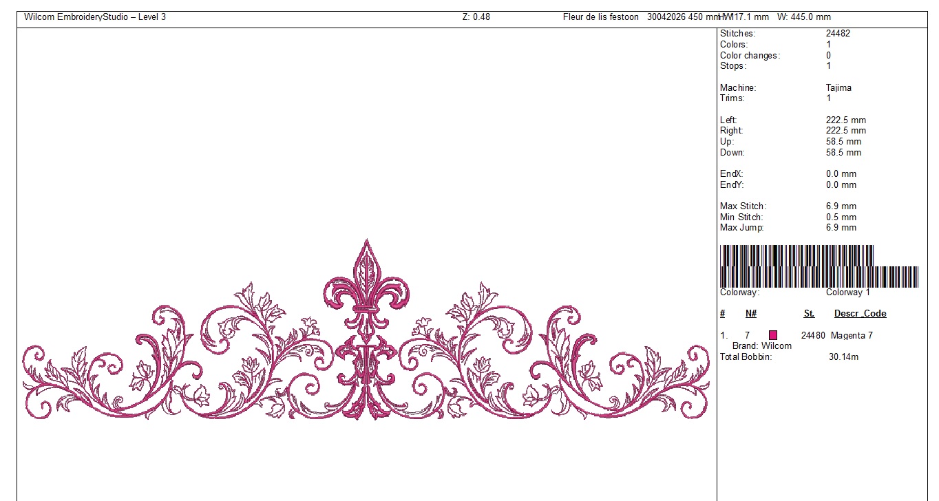 445 mm x 117 mm / 17.5" x 4.6" – 24,100 stitches