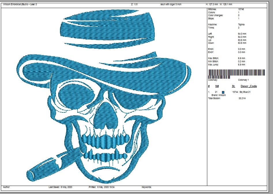 Skull in Hat with Cigar Machine Embroidery Design