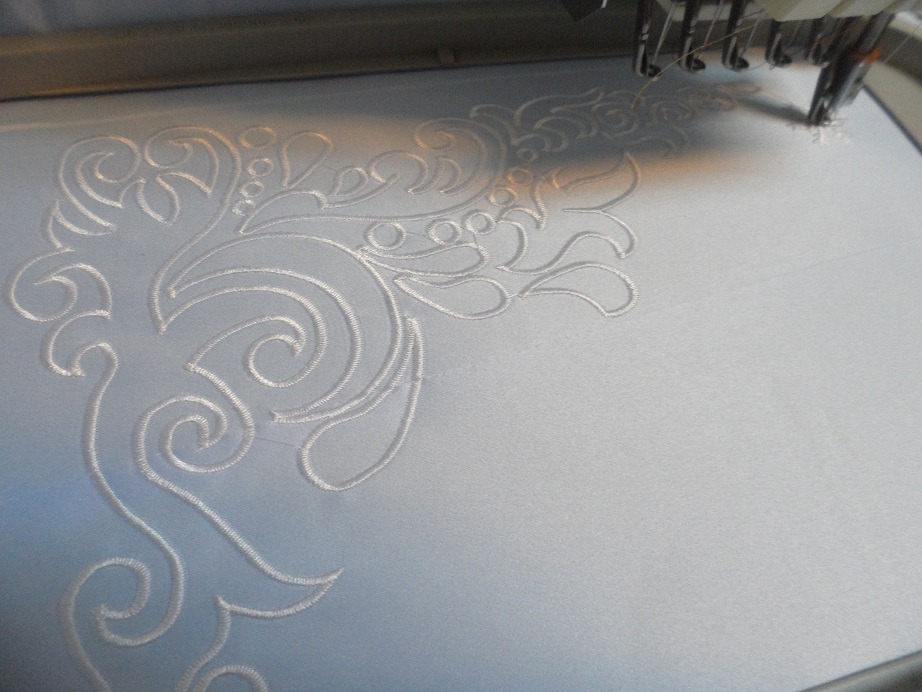 - Дизайн 2: Горизонтальная нижняя кайма с центральным акцентом в виде лилии (285x190мм, 17 800 стежков)